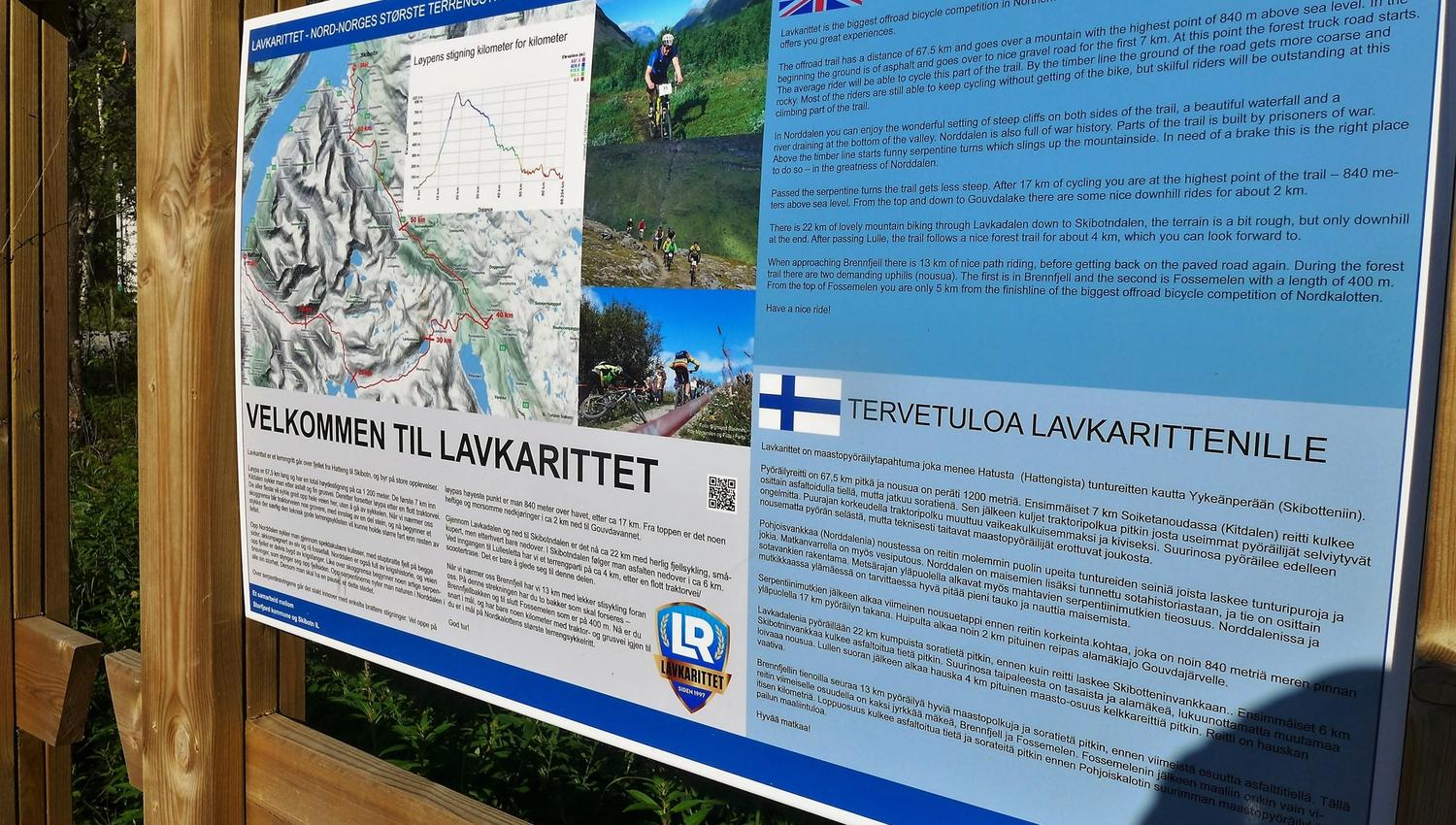 Lavkaløypa is a 68-kilometre (42-mile) mountain bike trail that follows the route of the Lavkarittet, one of Northern Norway's most famous mountain bike races, held in the second weekend in August. The route starts in Hatteng, Storfjord's municipal centre, runs up the Kitdal valley to the summit, which lies at around 800 metres (2,600 feet), before descending into the Skibotndal valley, ending in the village of Skibotn.