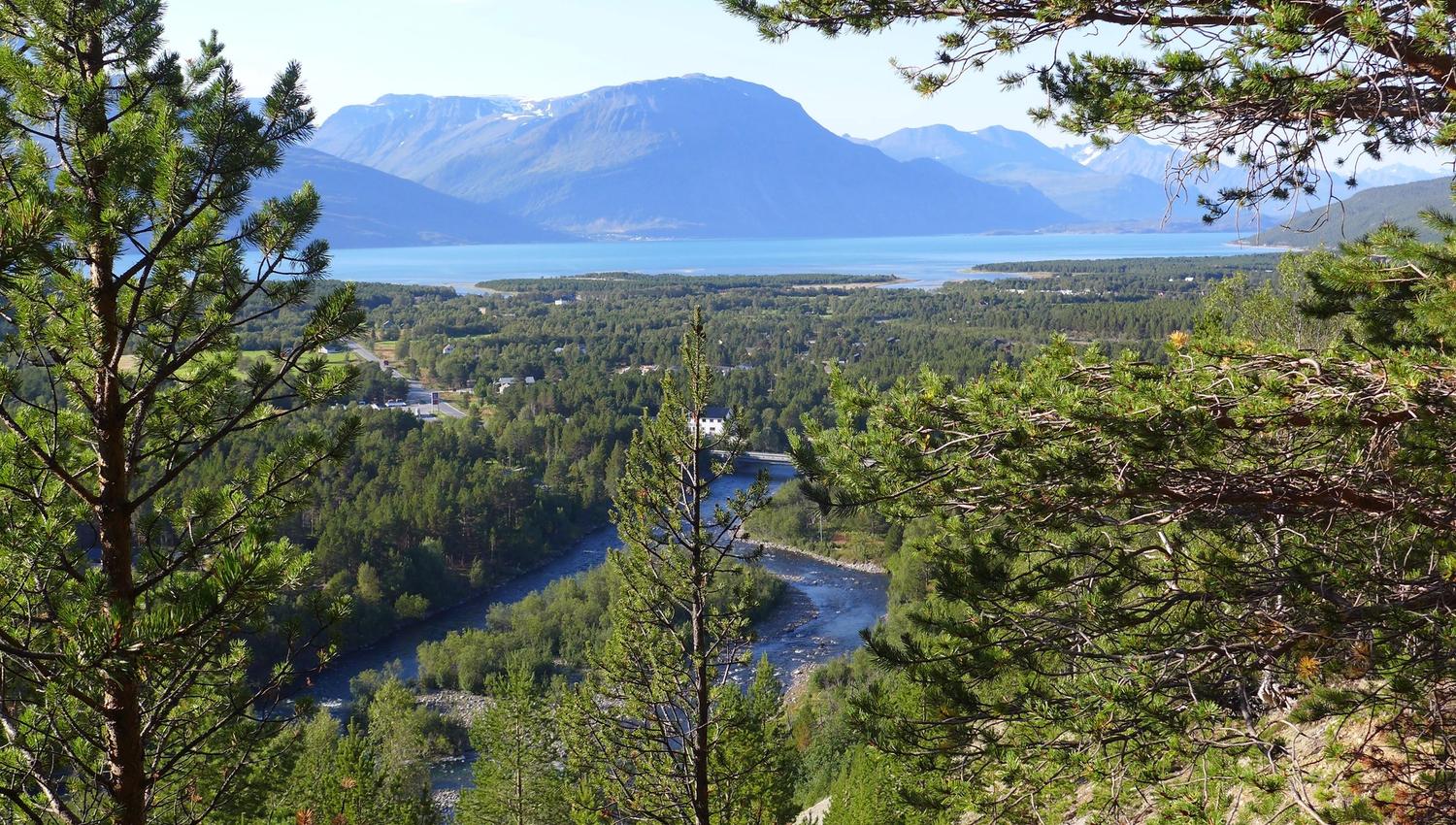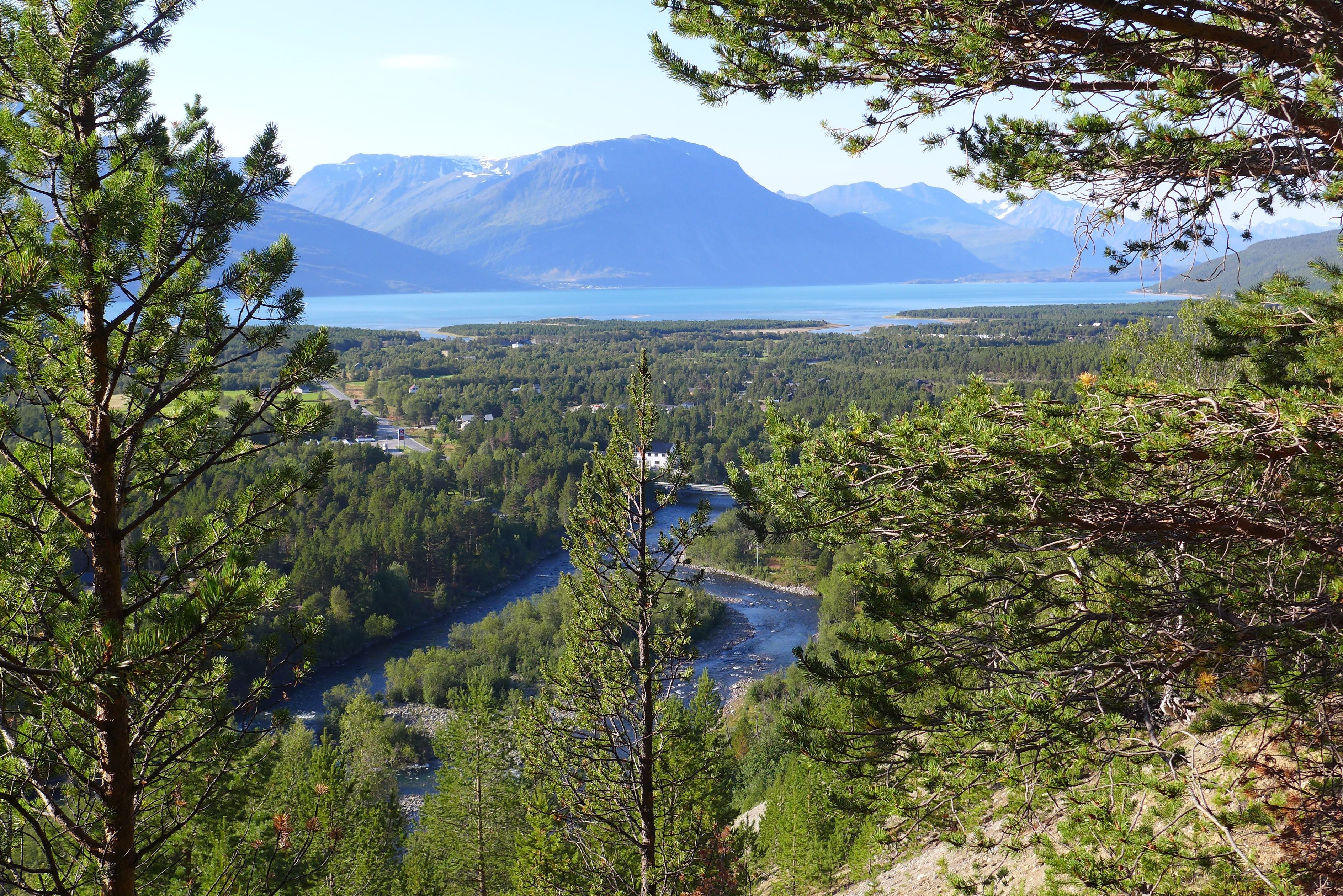 Suddenly, you are down on the main road, and enjoying a fast 8 kilometres (5 miles) along a wide shoulder. There isn't much traffic, and the surface is excellent. However, a waymarker directs you into a stretch of pine forest, and the last 12 kilometres (7 miles) through the forest are a very pleasant ride along narrow paths and tracks. It's a bit bumpy in places, over tree roots and thick layers of brown pine needles. And there are a few steep uphill bits thrown in for good measure, before you can finally stop and look out over Skibotn, the Lyngenfjord and Lyngen Alps from a ledge perched above the village.
