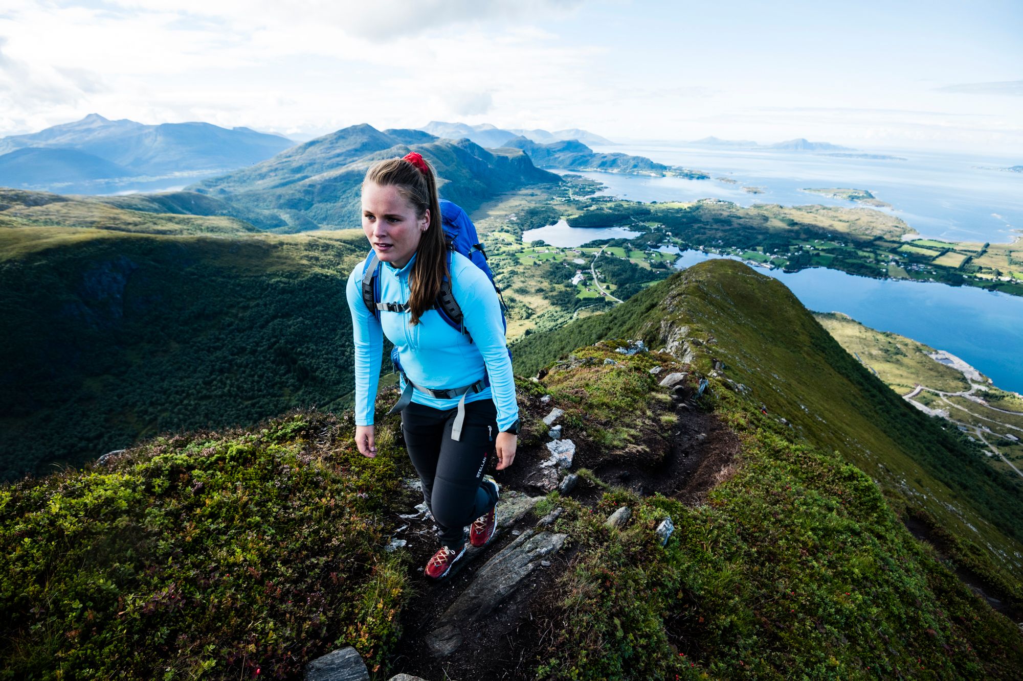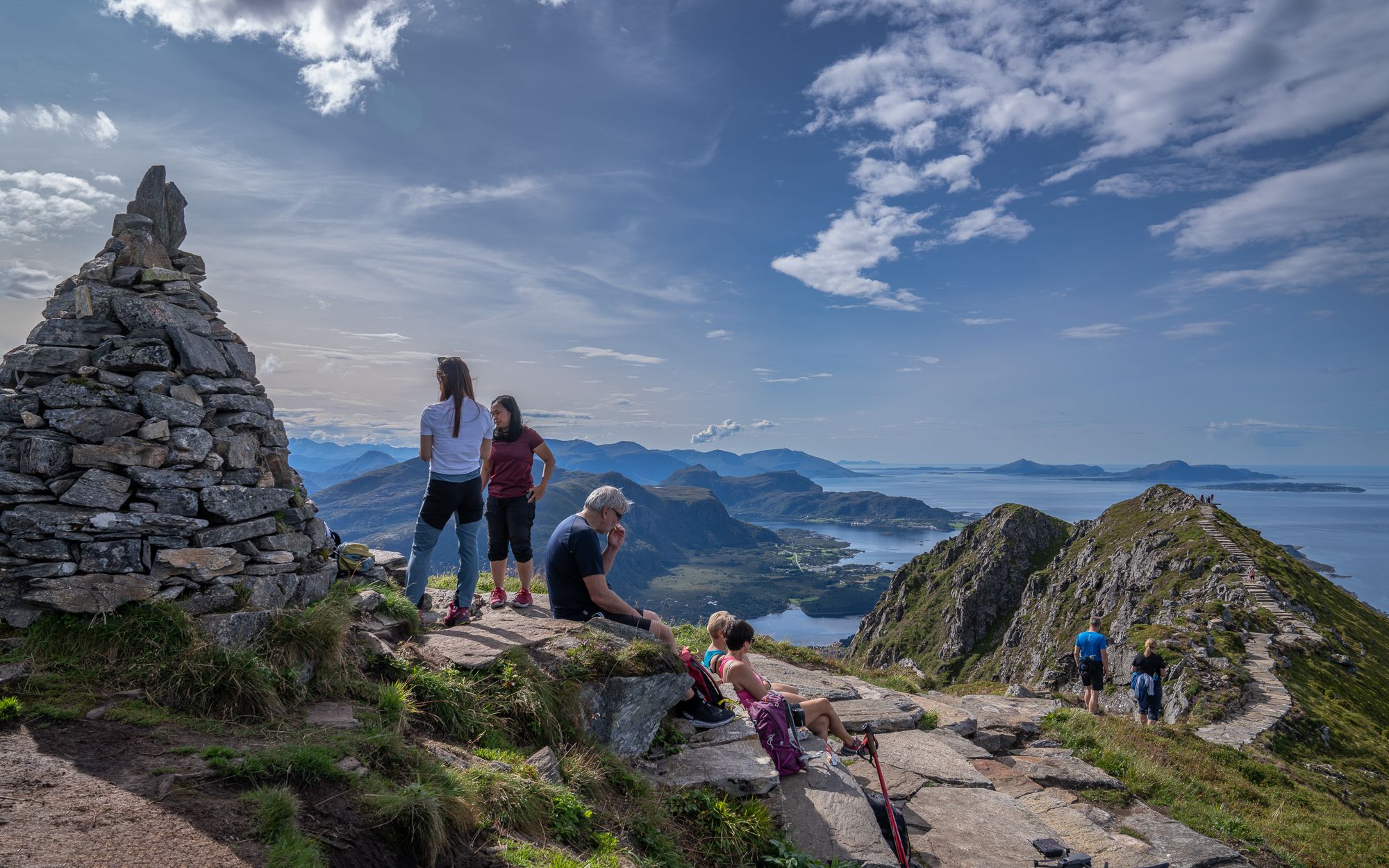 Follow the well-marked path, stairs, and signs up the western ridge towards Rørsethornet (about 659 m above sea level). Stairs are built all the way. You'll transition from road to rocky paths and stairs. The stairs lead you through the forest and above the treeline, offering stunning ocean vistas. The stairs take you to a viewpoint before following a trail along the ridge. The final part involves a narrow ridge walk to the summit cairn. Return the same way, or continue along the narrow ridge to Ræstadhornet, adding about an hour (round trip).