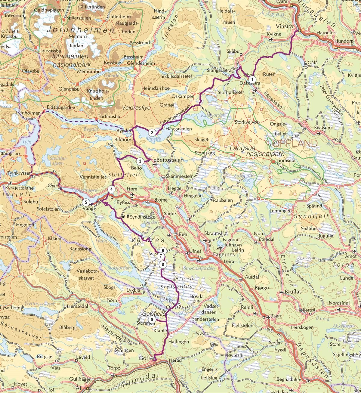 From Beitostølen, turn right onto Beitestølevegen and follow the Mjølkevegen signs towards Slettefjellvegen. The ascend to up the Slettefjell mountain pass is spectacular although challenging - a climb of approx. 500 meters to the top at 1315 masl. The view in clear weather, though, is stunning and very rewarding, both behind you towards Jotunheimen and ahead of you towards Vang. The following descent is even steeper, so watch out and take care! We recommend a stop and a 15 min. walk to the Sputrefossen waterfallon the right side of the road, before you reach Slettefjellkiosken, a good place for refuelling - for both riders and bike batteries!