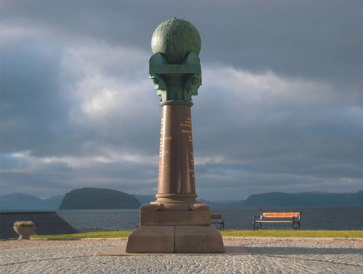 The Struve Geodetic Arc was the first technical and scientific object to be inscribed on the UNESCO World Heritage List. Measurements were made in the form of a chain of triangulation along the meridian stretching from Ismail on the Black Sea in the South to Fuglenes in Hammerfest in the North. A meridian is an imaginary line on the Earth's surface running from pole to pole. The Meridian Column marks the northernmost measure point on Fuglenes in Hammerfest.